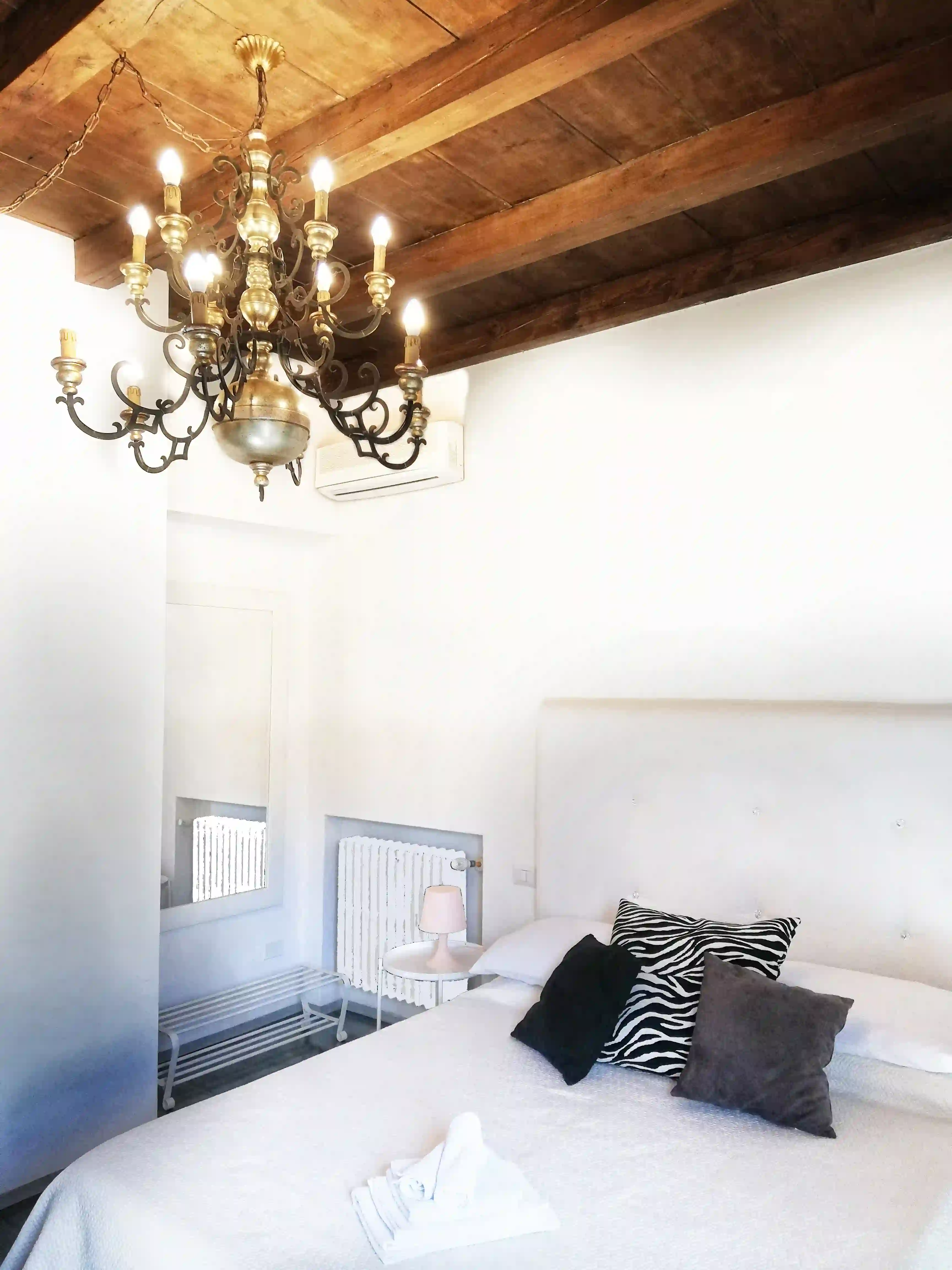 Alcune stanze custodiscono ancora i travi a vista, che raccontano la storia della casa e regalano un'atmosfera calda, autentica, quasi sospesa nel tempo.